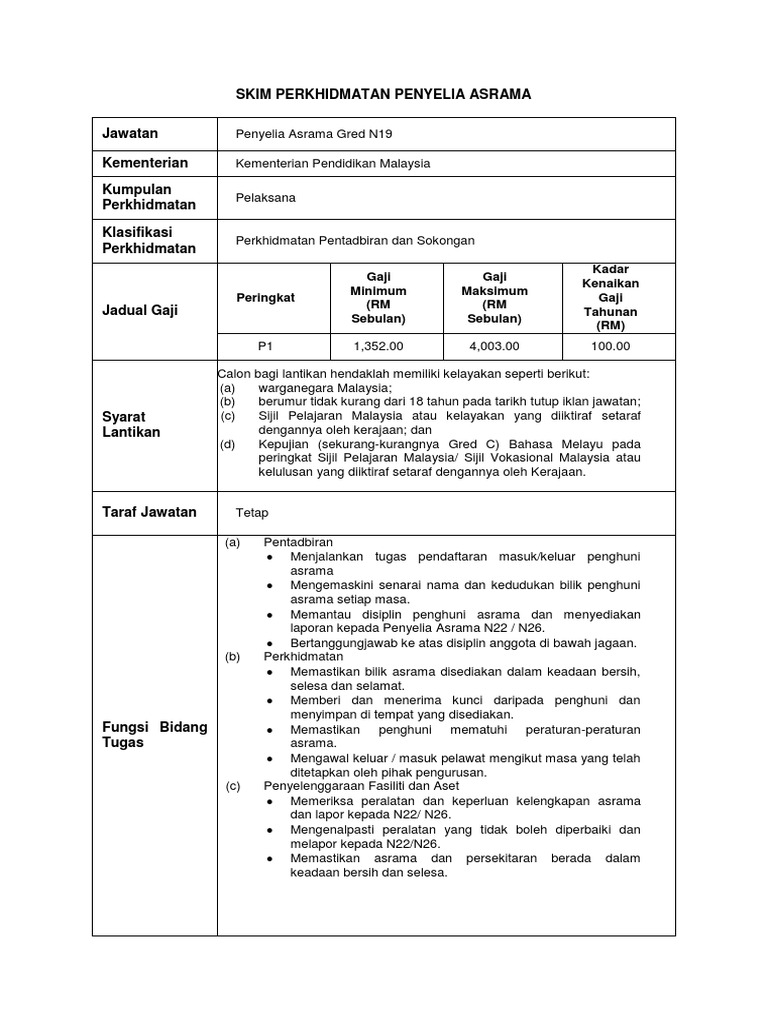 Penyelia Asrama Gred N19 Tugas Pembantu Penerbitan Gred N19 Serta Gaji