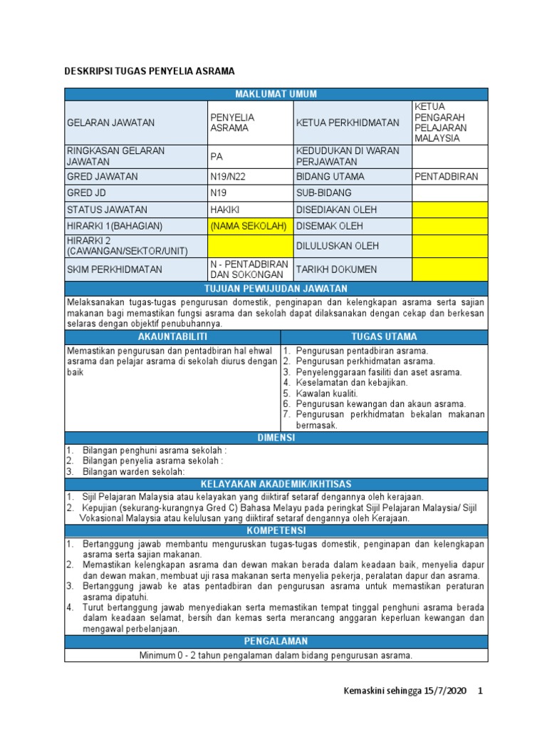 Deskripsi Tugas Penyelia Asrama Gred N19 Jawatan Kosong